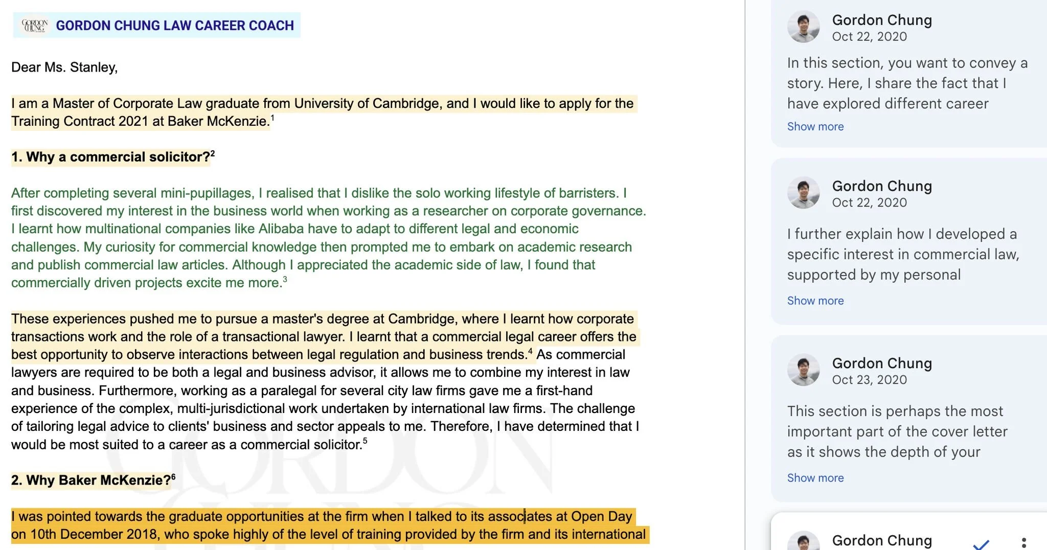 This is a Cover Letter I prepared that landed me a job offer at one of the biggest international law firms in London. In this annotated sample letter, I provided detailed footnotes and explanations to illustrate the key elements of a good cover letter and how you should tailor your letter to a specific law firm. A similar approach can be used when applying to other international law firms.